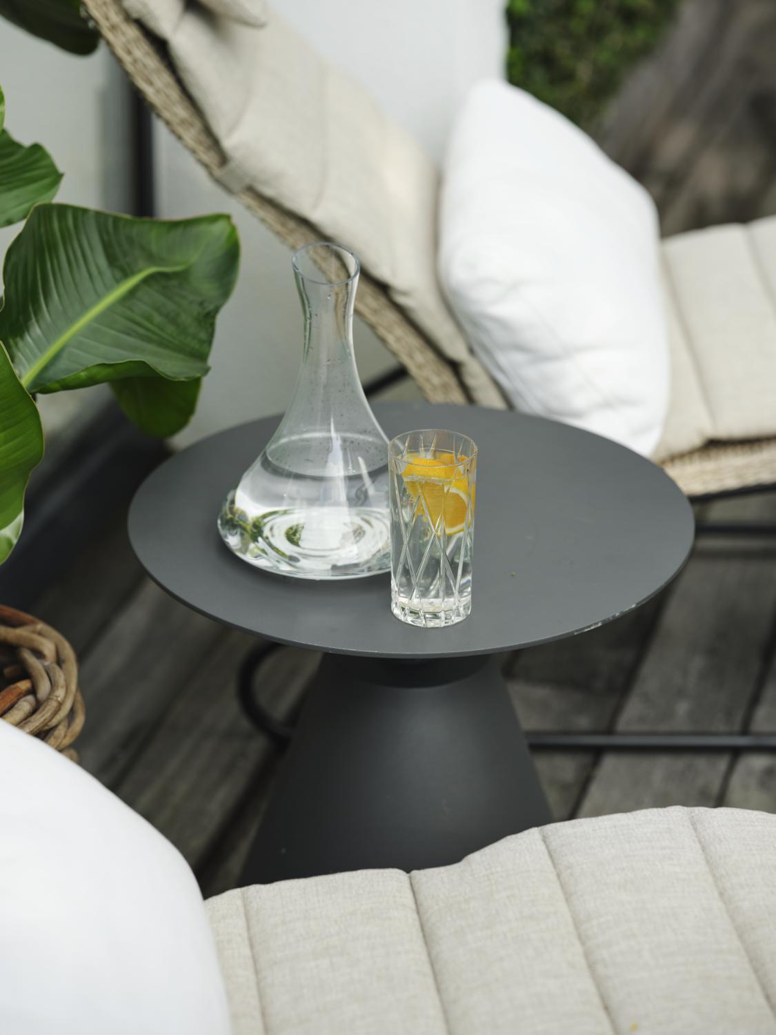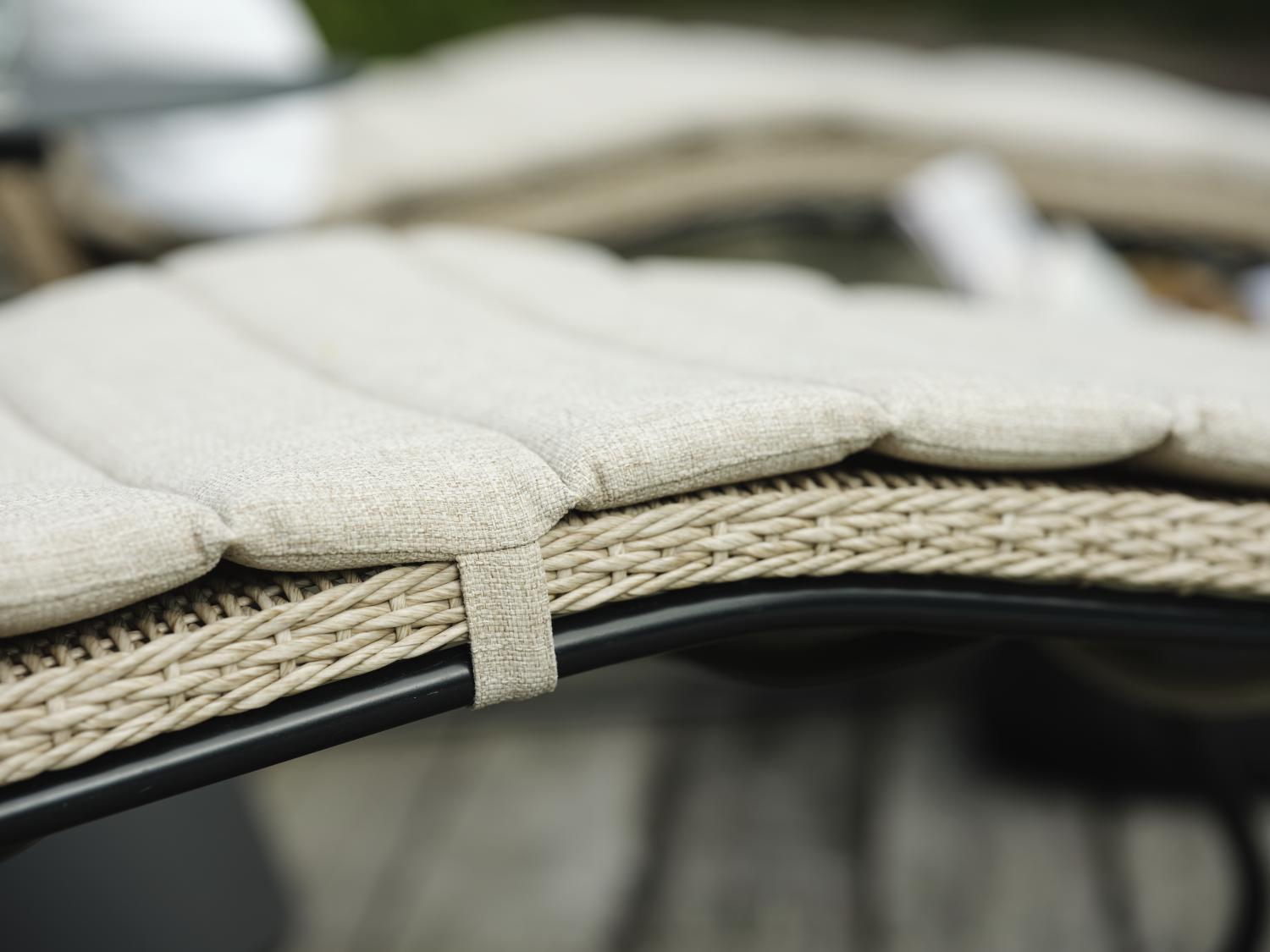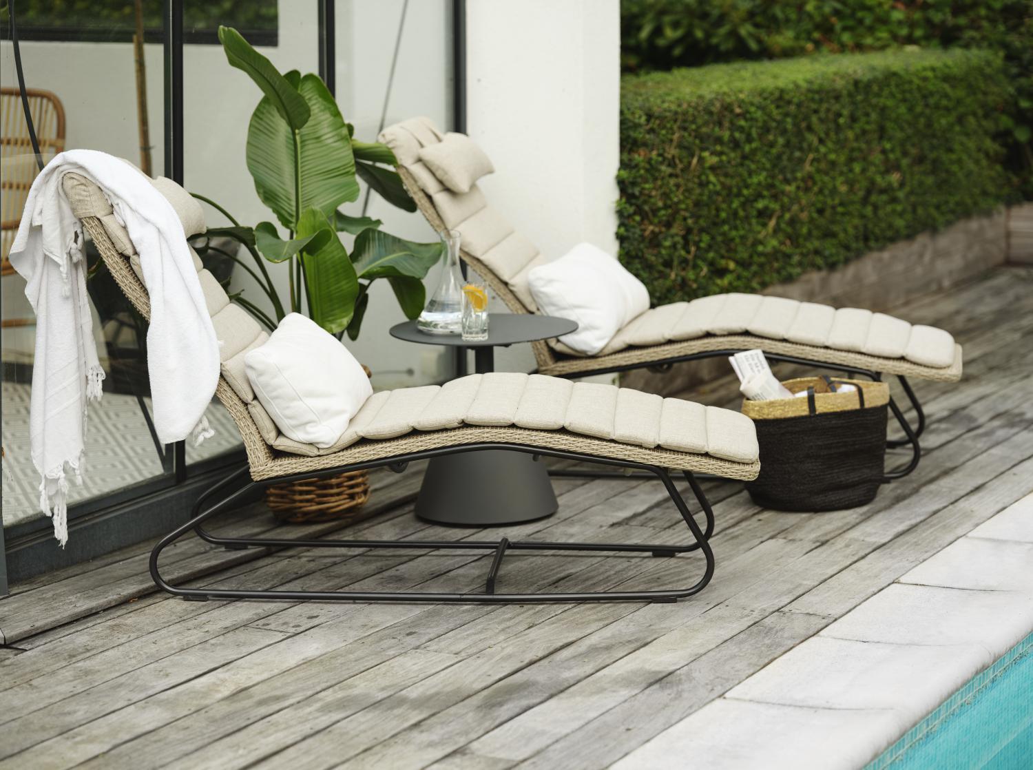 Akleja vilsäng är en skön plats för slappa stunder. Vinkeln i ryggstödet är anpassad för avkoppling och den snygga dynan med huvudkudde i olefintyg ger en mjukare vila. Öppen och stabil ram i svart aluminium.