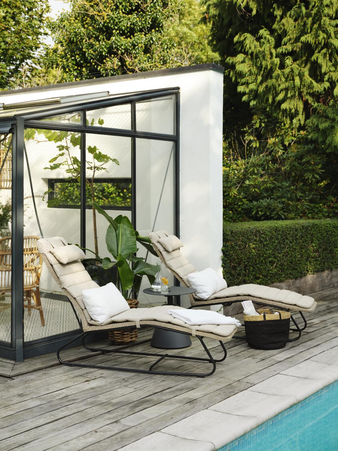 Vilsam med en luftig lätthet. Akleja blandar stabila och öppna stommar med elegant flätad konstrotting. Perfekt både för avkoppling och för ögat.