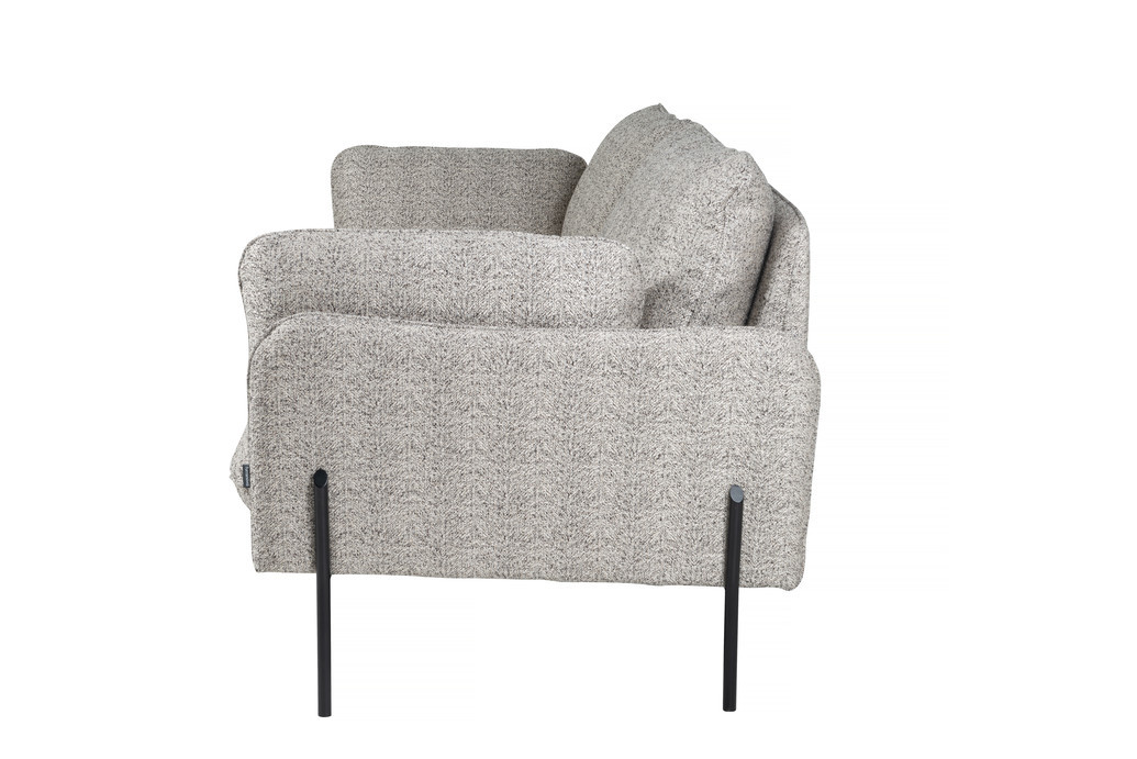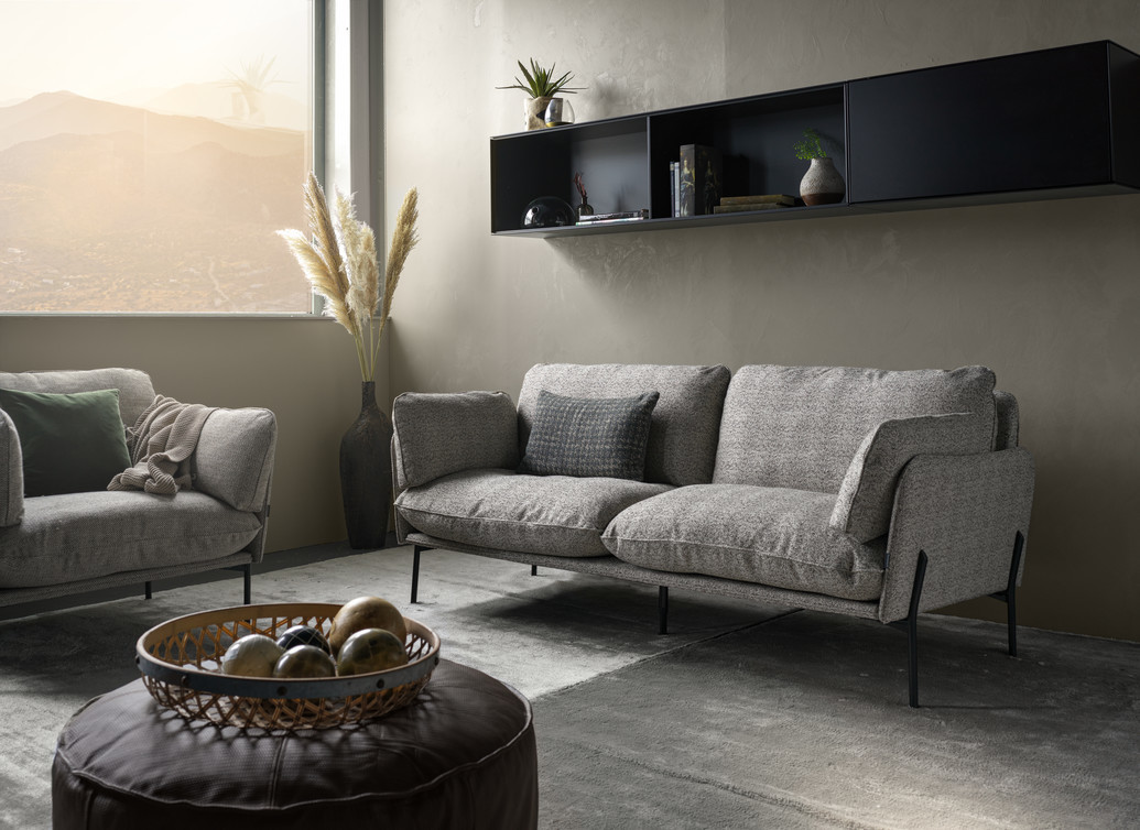 Modern soffa med rejäla dynor och smala svarta metallben.
