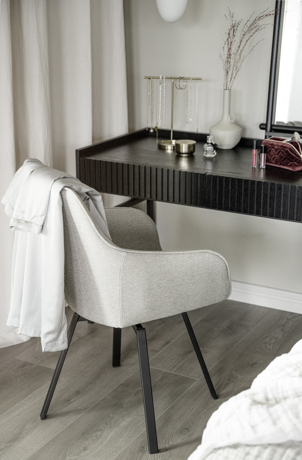 Alison karmstol i beige tyg har precis som populära Alison stol ett snurrbart underrede i 360 grader. Den kupade stoppade sitsen och de höga armstöden gör stolen bekväm och ombonad att sitta i. Alison har ett tåligt beige tyg i samma jordnära färg som Alison stol för att kunna matchas tillsammans på ett smakfullt sätt. Träet inuti sitsen består av 100 % FSC-certifierat trä och benen består av svart pulverlackad metall.
