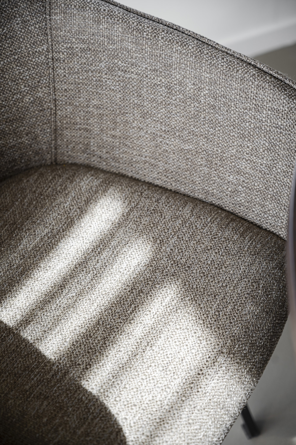 Alison karmstol i mörkbeige tyg har precis som populära Alison stol ett snurrbart underrede i 360 grader. Den kupade stoppade sitsen och de höga armstöden gör stolen bekväm och ombonad att sitta i. Alison har ett tåligt mörkbeige tyg i samma jordnära färg som Alison stol för att kunna matchas tillsammans på ett smakfullt sätt. Träet inuti sitsen består av 100 % FSC®-certifierat trä och benen består av svart pulverlackad metall.