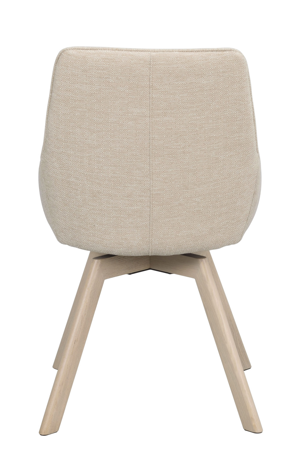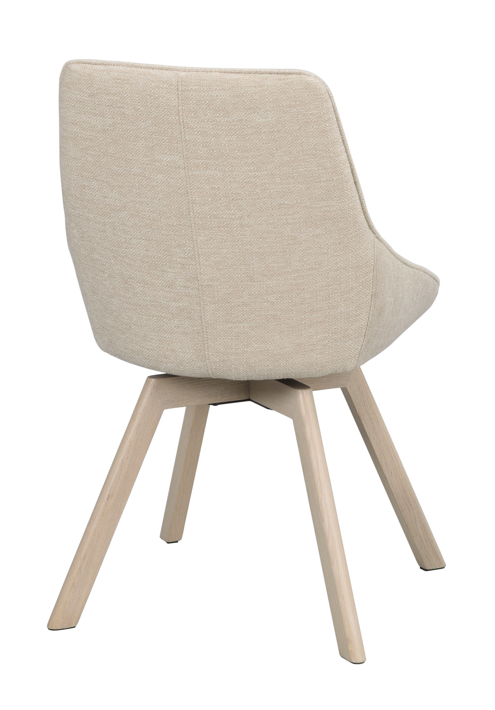 Populära Alison stol med träunderrede och snurrfunktion. Här syns den i ett tåligt ljusbeige tyg och med ben i vitpigmenterad ek. Alison har en stoppad sits med hög sittkomfort i kupad design och ben med snurrfunktion i 360 grader. Stolen passar perfekt runt matbordet men även som udda stol till skrivbordet. Alison är FSC®-certifierad och finns även i andra jordnära färger. Säljs endast i 2-pack.