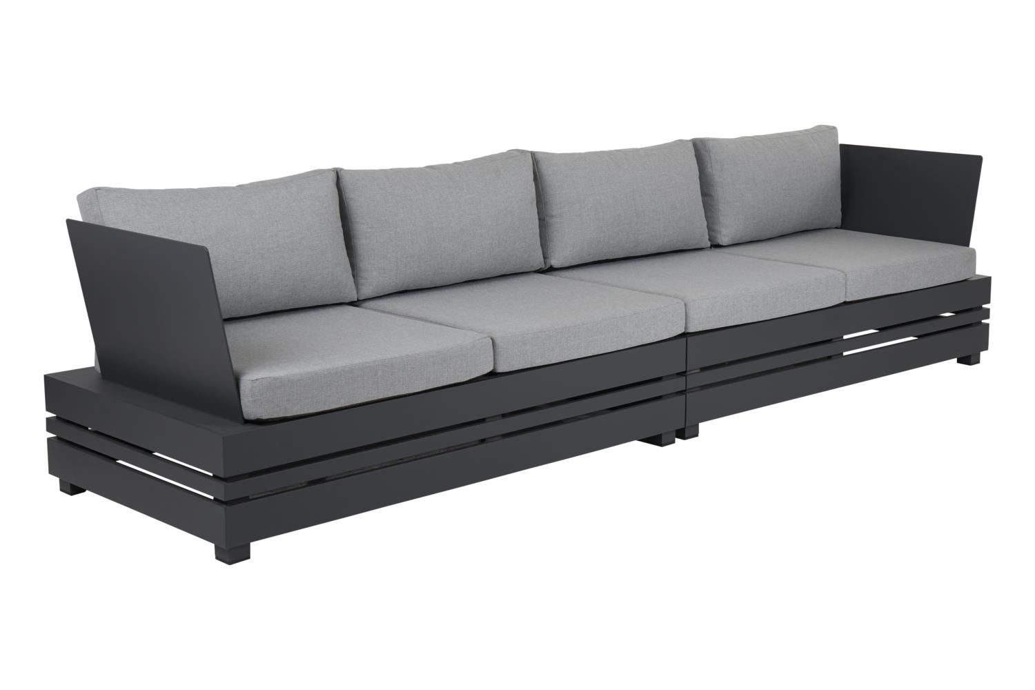 Byggbar soffa i antracitfärgad aluminium med dynor i olefintyg. Avsedd för utomhusbruk.