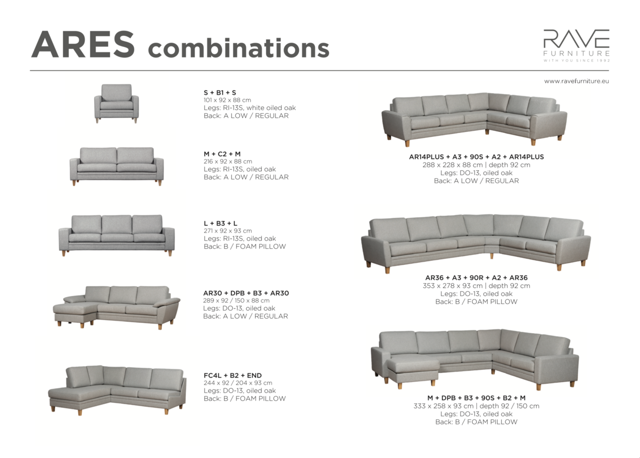 Med sin breda tygvagn finns där tyger och färger för alla smaker. 7 stycken olika alternativ av armstöd, och en mängd olika ben i färger och höjder att välja på, det kan inget annat än bli bra när man väljer en soffa som Ares.