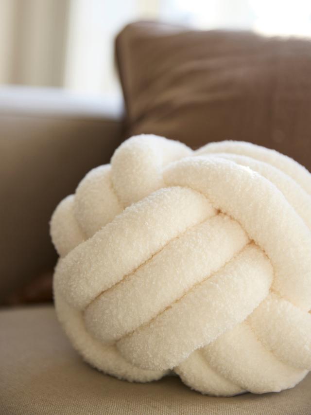 Bollformad kudde i form av nystan med mjukt flossat tyg. 22cm i diameter.