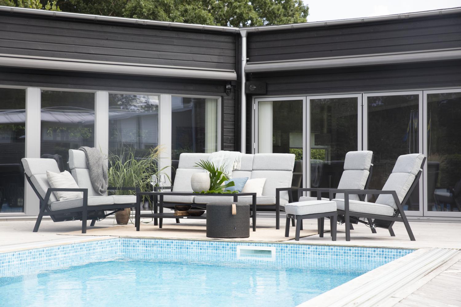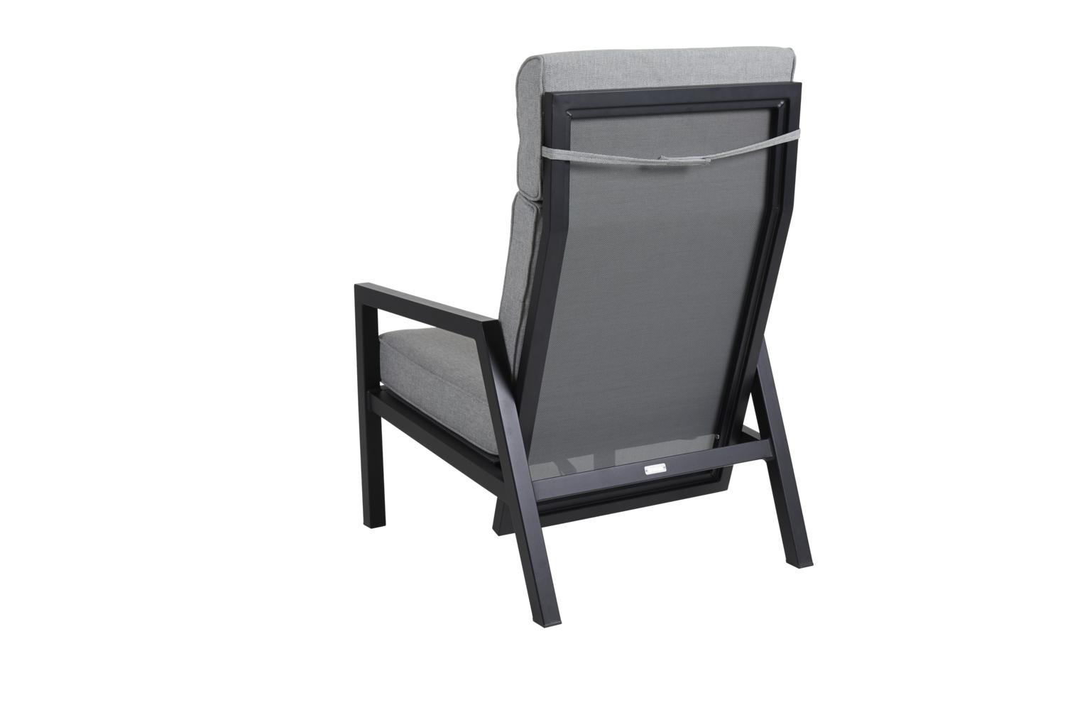 Positionsfåtölj i svartlackad aluminium inklusive väderbeständiga dynor i grått olefintyg.