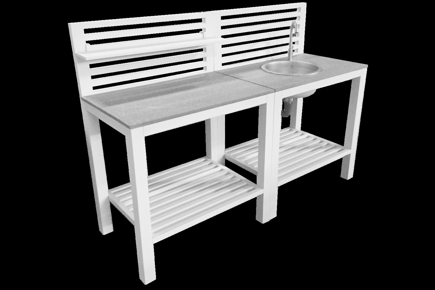 Vackert utekök i vitlackad aluminium med stenskiva.