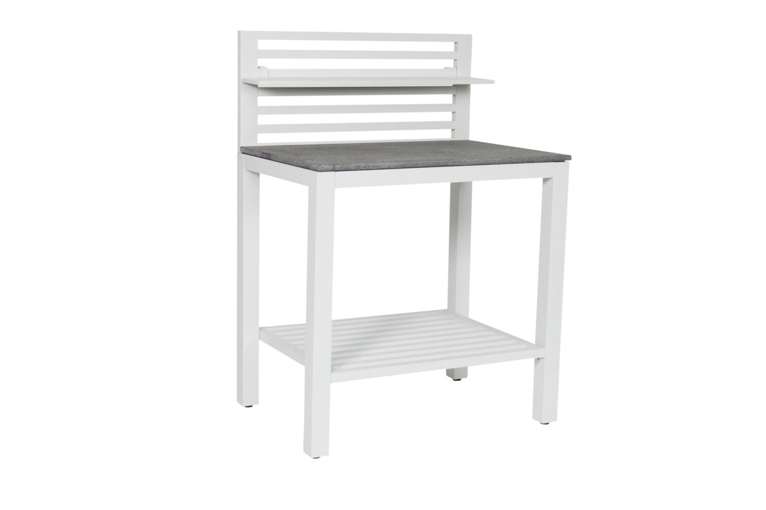 Vackert utekök i vitlackad alumnium med stenskiva och hyllplan.