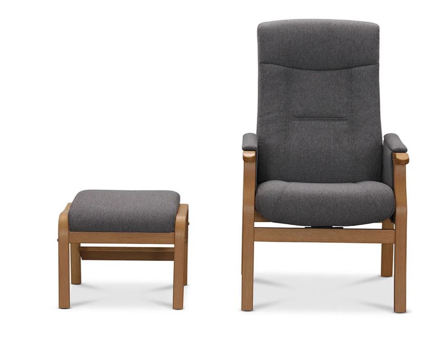 Seniorfåtölj i grått tyg med underrede i lackad ek.