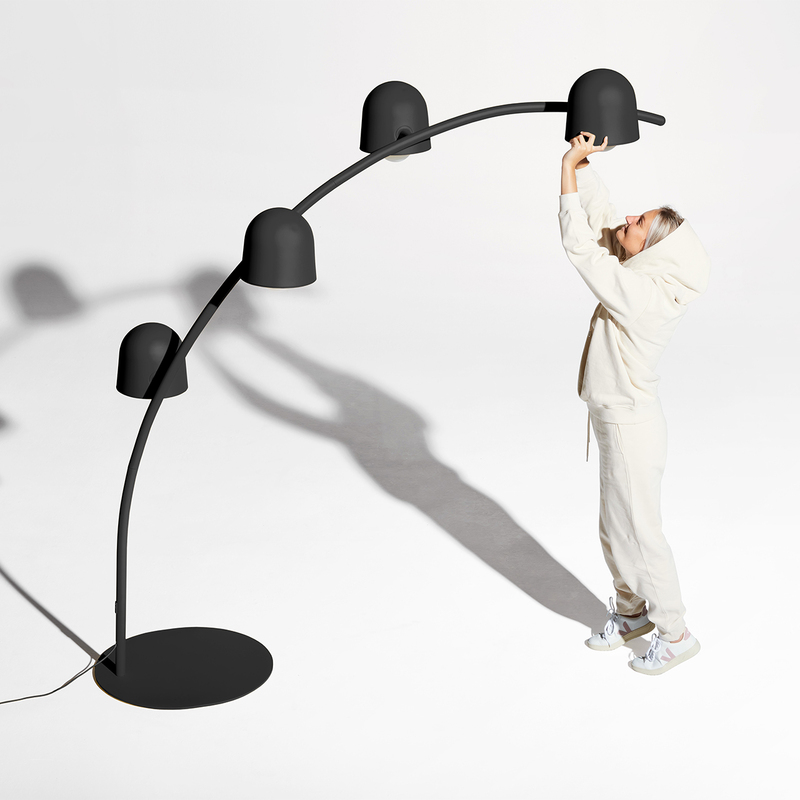 Oväntade möten ute på stan är alltid de bästa. Med Big Lebow kan du ta med den spontaniteten inomhus. Det spelar ingen roll var du ställer den här bågformade golvlampan €“ vid middagsbordet eller soffan, över ett mötesbord eller var du vill €“ Big Lebow lutar sig framåt som den udda gatlampa den är. Den kraftfulla 2,34 meter höga bågen som hör till den här lampan är, precis som den tunga foten, gjord av pulverlackerat stål. De justerbara aluminiumskärmarna gör att du själv kan bestämma vart ljuset ska riktas. Och quiz-knappen? Det är dimmern. Den här stora golvlampan bugar sig för dig i färgerna anthracite, banana yellow eller light grey. Två Big Lebow kan kopplas ihop med ett anslutningsdon för att skapa en komplett båge.