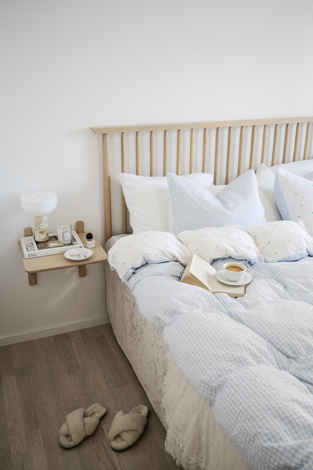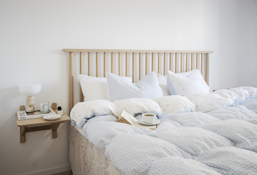 Camrose sängbord i vitpigmenterad ek ger sovrummet ett elegant uttryck. Placeringen på väggen anpassas enkelt efter sängens höjd vilket gör att sängbordet passar till alla sängar. Camrose sängbord matchas utmärkt med sänggaveln Riggins i samma färg. Camrose finns även i svart ek.