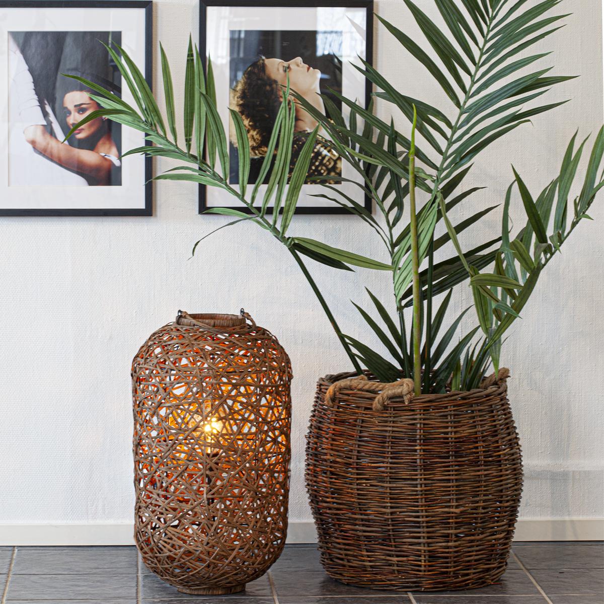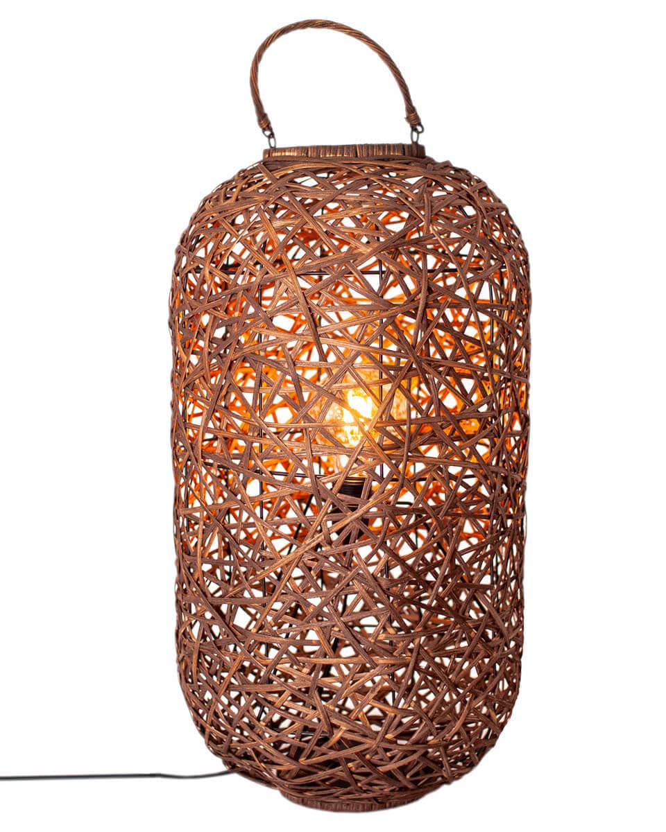 Ställ golvlampan i en helt ny dager. Diego handgjorda golvlampa kommer i vacker rotting i brunt med hålrum, som med en amberfärgad ljuskälla avger det vackraste av sken. Formen liknar en lykta och passar både inomhus och i ett isolerat uterum där den slipper fukt och kyla. Det bekväma handtaget och den långa sladden på 250 cm gör lampan lätt att flytta runt. Måtten på lampan är 65 cm i höjd med en diameter på 35 cm. Ljuskällan till Diego golvlampa måste köpas separat. Det är en sockel E27 med 60 mm i diameter som rekommenderas. Om du vill ha lampan dimbar går det att koppla den mot en dimmer. Denna enkla men ändå speciella och flexibla golvlampa blir garanterat en iögonfallande del av ditt rum och ger ett mysigt ljussken.