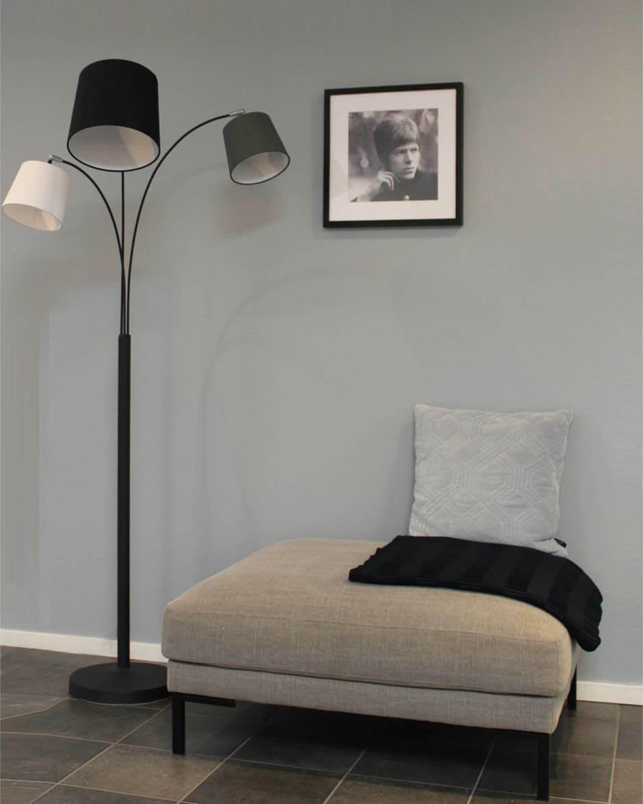 Foggy är en golvlampa med en höjd på 175 centimeter. På den enkla basen sitter tre armar i olika längd med 3 skärmar i olika mått med blandade färgställningar i tonerna grå, svart och vit. Golvlampan blir dekorativ vid din soffa eller favoritfåtölj. Till lampan behöver du 3 ljuskällor med E14 sockel.