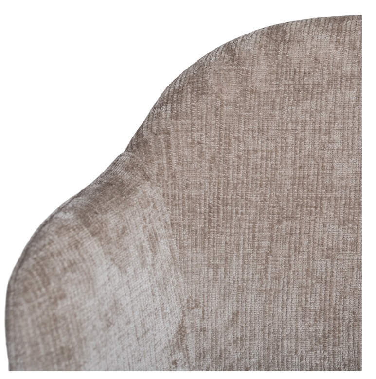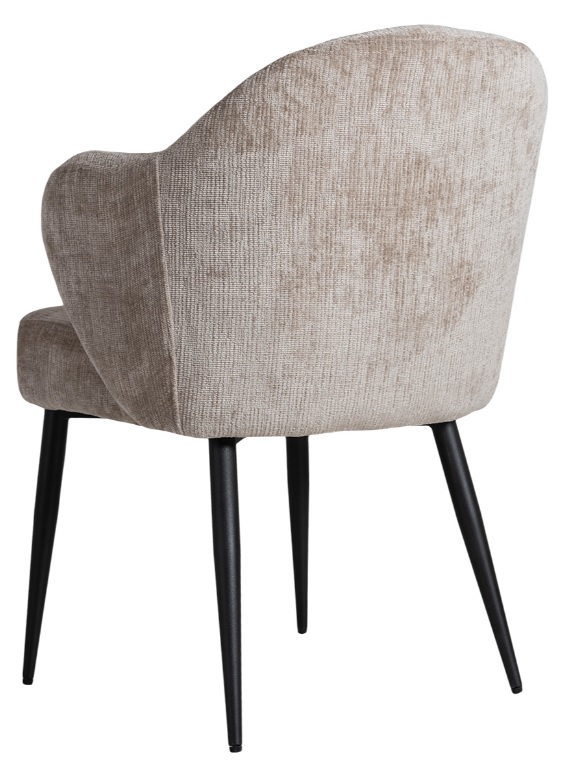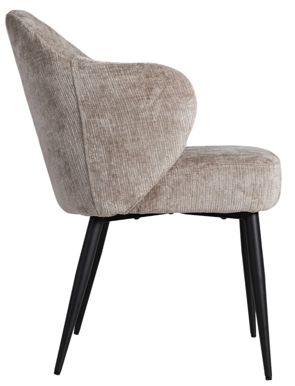 Denna stilrena stol förenar komfort och design med sin mjuka, jordnära klädsel och eleganta, svarta metallben.