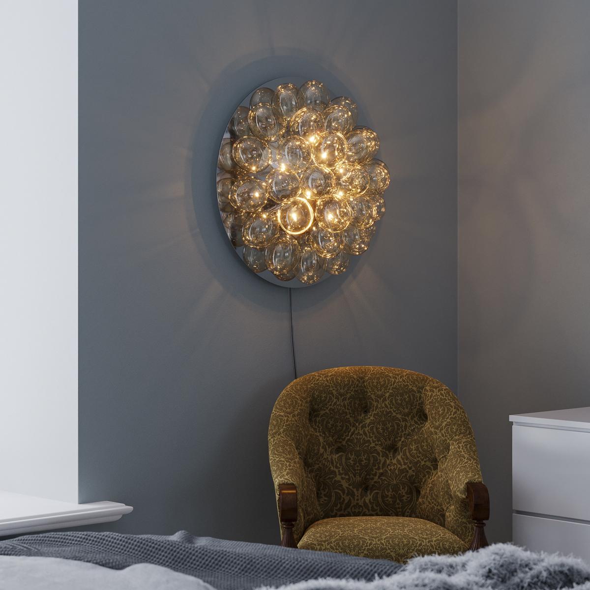 Gross vägglampa passar dig som vill att din vägglampa ska vara mer än bara en lampa. Gross vägglampa är maffig och dekorativ och smyckar din vägg likt ett konstverk. Lampan består av 30 vackra glaskulor, i färgen amber eller rökgrå. Gross vägglampa har en diameter på 60 centimeter och ett djup på 30 centimeter. Glaskulorna har en diameter på 10 centimeter. Sladden till Gross vägglampa är transparant och 2 meter lång och lampan har en inbyggd kvalitetsdimmer. Gross vägglampa är en nykomling i vår populära Grossfamilj och gör sig snygg både i sin ensamhet, som ett komplement till dina tavlor och konstverk eller i samma rum som exempelvis Gross taklampa eller Gross bordslampa. Till Gross vägglampa behöver du 8 ljuskällor med G9 sockel. Vägglampan är enkel att montera upp på väggen med ett fäste och 4 skruvar.