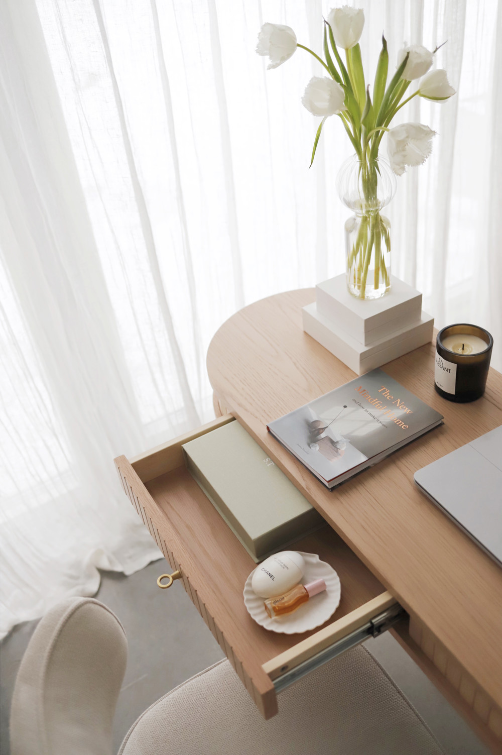 Avlastningsbordet Haddington är med sin ovala form och mässingfärgade knoppar en stilren och trendig möbel. Det ribbade mönstret av massiv ek och två praktiska lådor gör att Haddington även kan användas som skrivbord på hemmakontoret eller som sminkbord i sovrummet. Den höga benställningen av pulverlackerad metall i sandstruktur ger en luftig känsla i rummet. I serien Haddington ingår även skåp och sideboard.