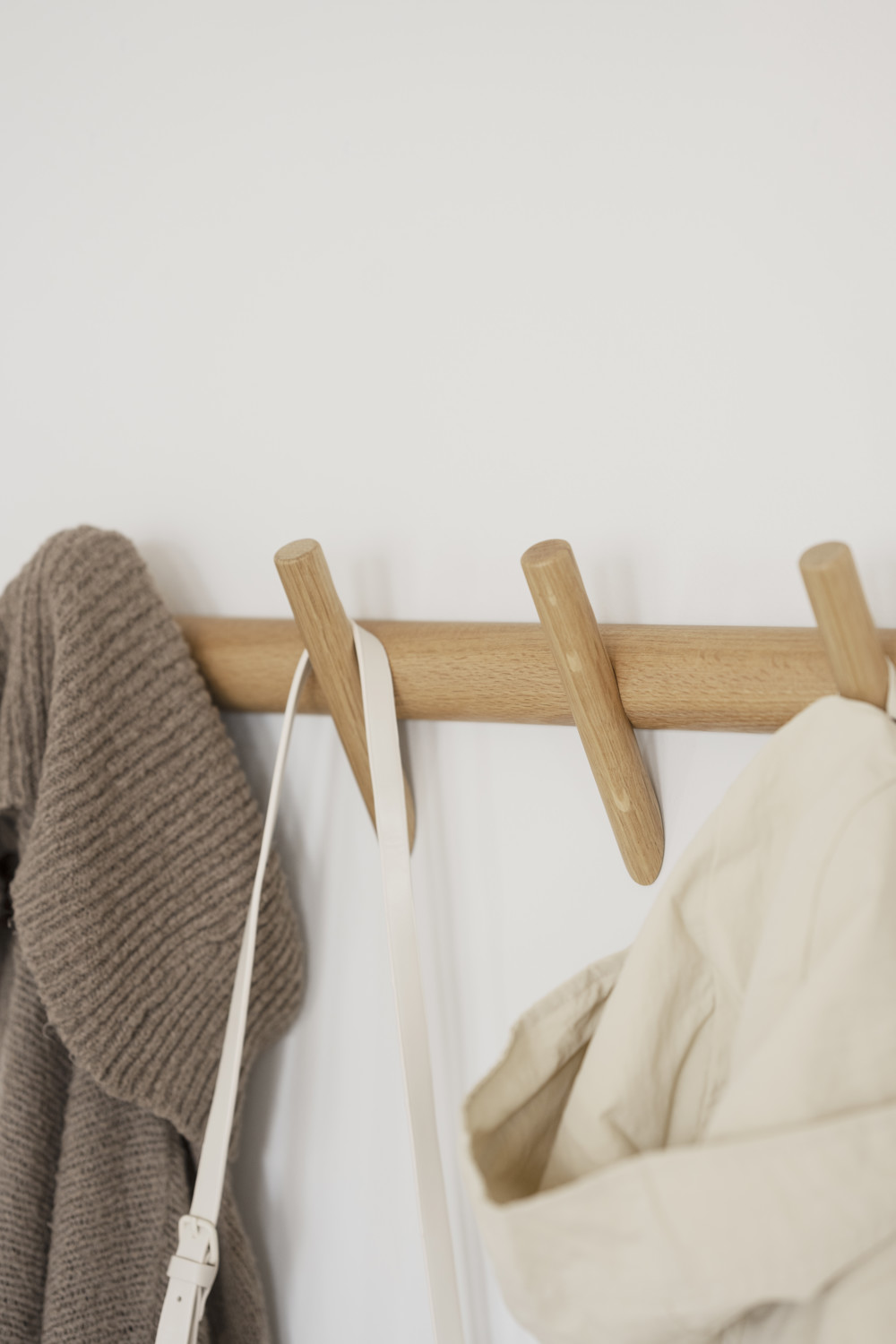 Hillmond kroklist i massiv lackad ek är en vacker och stilren klädhängare som hjälper dig att hålla ordning i hallen, sovrummet eller klädkammaren. De runda formerna som möter de raka linjerna utstrålar enkelhet och minimalism som är både vacker och funktionell. Kollektionen Hillmond är synonymt med hög kvalitet, vackra trädetaljer och harmonisk skandinavisk design. Kombinera gärna med andra produkter från samma kollektion för en enhetlig stil.