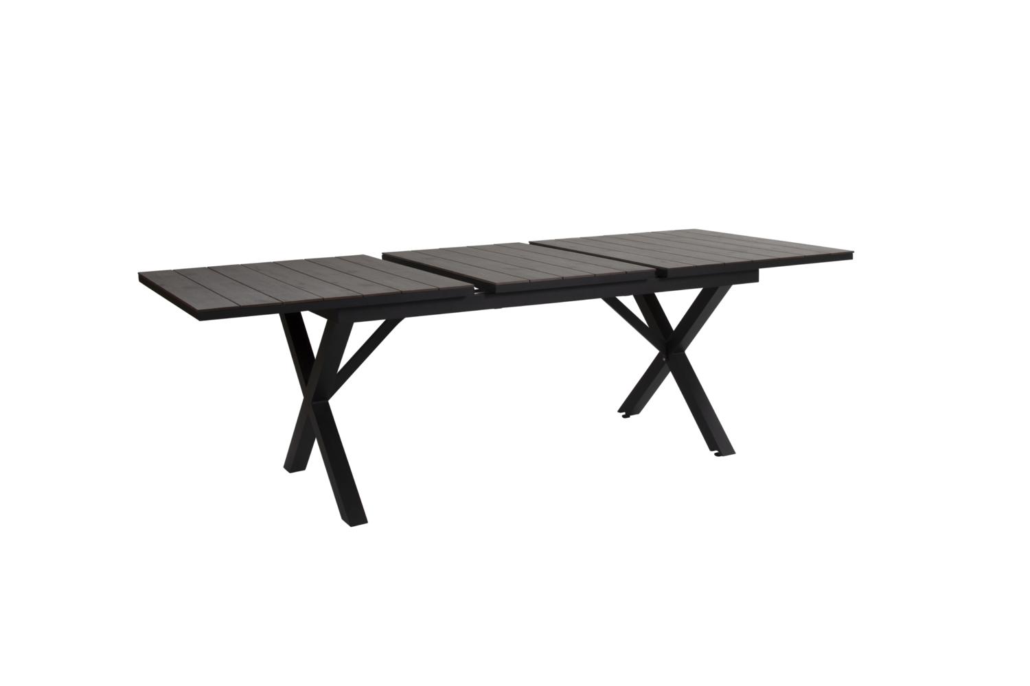 Ett praktiskt matbord 166×100 cm. i svartlackad aluminium med tvärgående ribbor av högtryckslaminat med trästruktur. Förlängningsbart upp till 226 cm.
