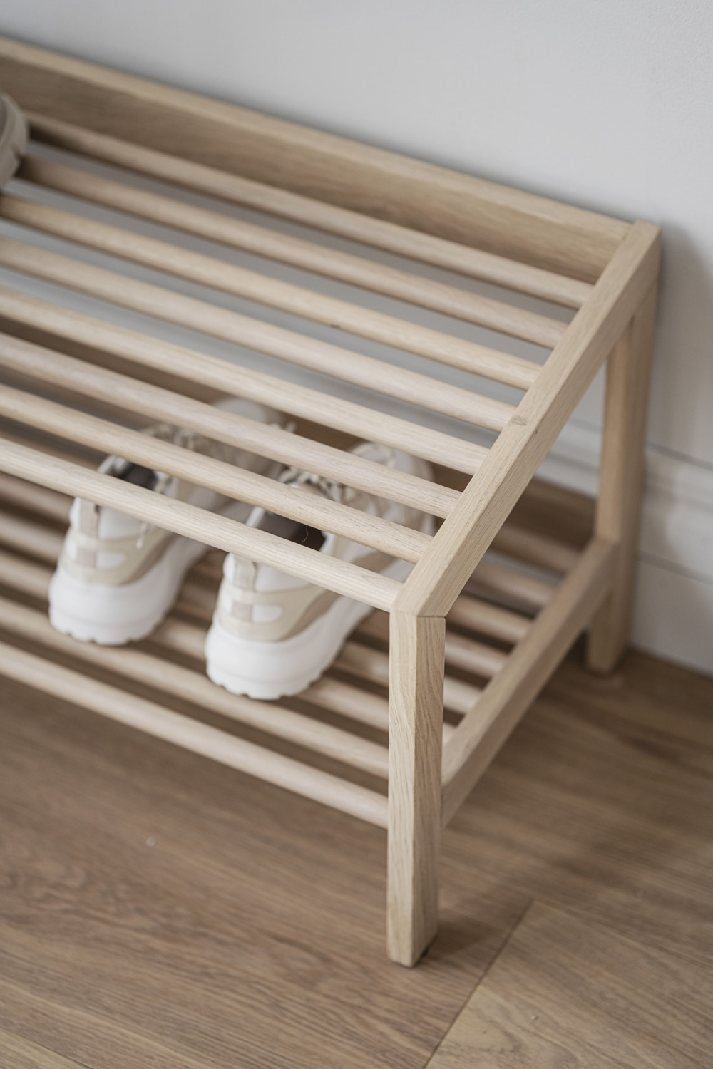 Hillmond skohylla i vitpigmenterad massiv ek har två hyllplan varav det översta hyllplanet är lätt vinklat vilket ger skohyllan en unik och modern design. Kollektionen Hillmond är synonymt med hög kvalitet, vackra trädetaljer och harmonisk skandinavisk design. De runda formerna som möter de raka linjerna skapar en balans som är både vacker och funktionell. Kombinera gärna skohyllan med andra produkter från kollektionen Hillmond för en enhetlig stil.