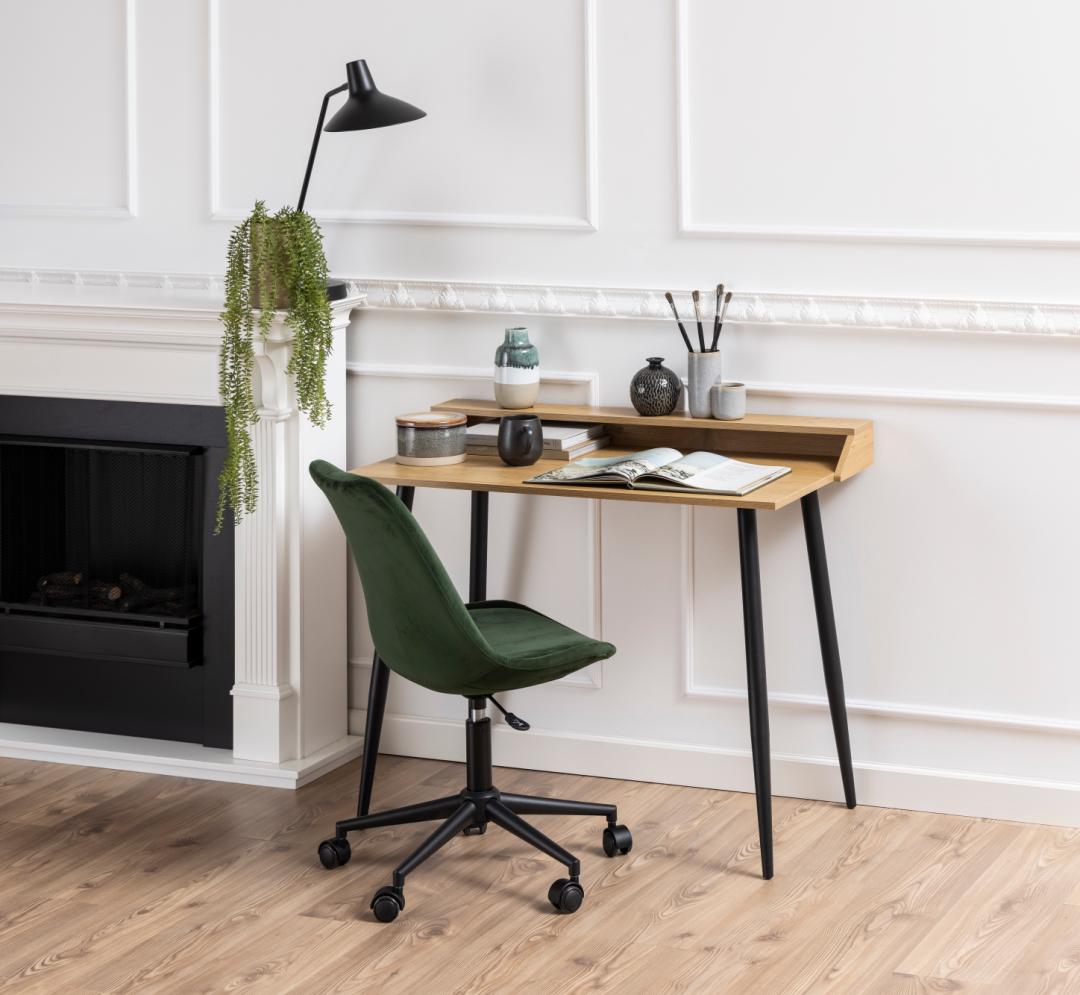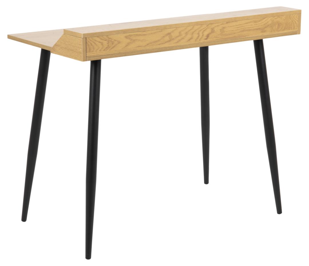 Att skapa en estetisk arbetshörna hemma är en piece of cake med detta öppna skrivbord. Hyllan låter dig hålla din arbetsplats organiserad. Utöver det ger den tidlösa kombinationen av grov vild ek-topp och mattsvarta metallben designen både struktur och kontrast som behagar ögat. Arbetet blir mycket roligare med det här skrivbordet.