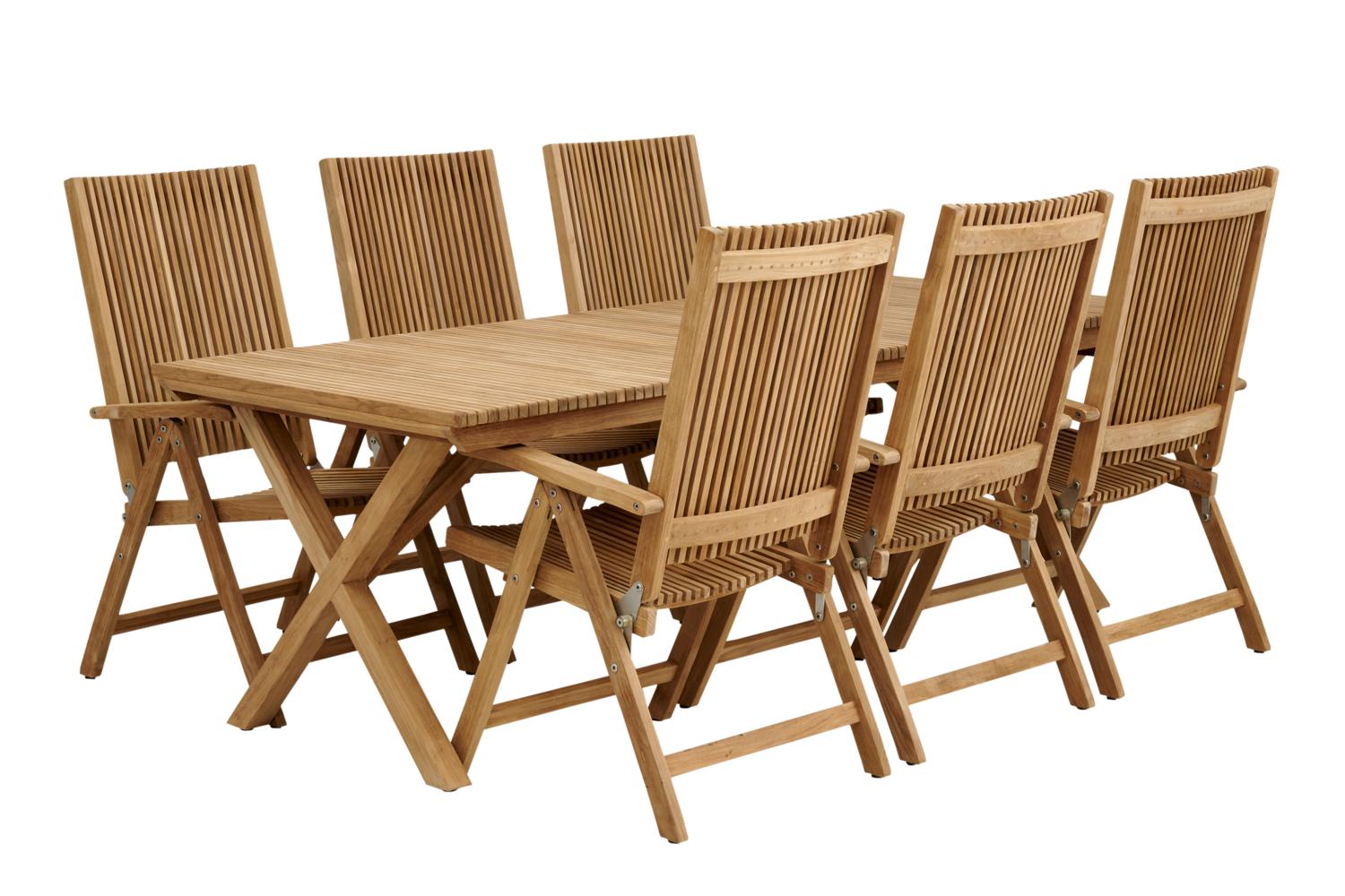 En vacker premiumgrupp med tvärgående teakribbor som genomgående inslag – Julita tar de raka linjerna från den skandinaviska designen med sig och skapar en skön matplats som sticker ut med sin stil samtidigt som den smälter in i omgivningarna.