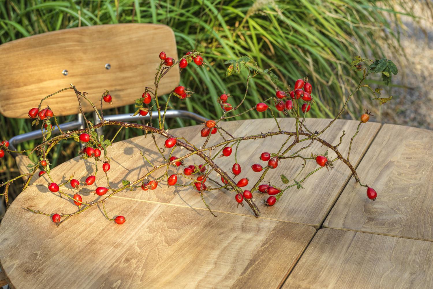 Elegant och modern grupp i teak och rostfritt stål bestående av runt bord med diamentern 110 cm samt fyra stolar som har vinkelbart ryggstöd.