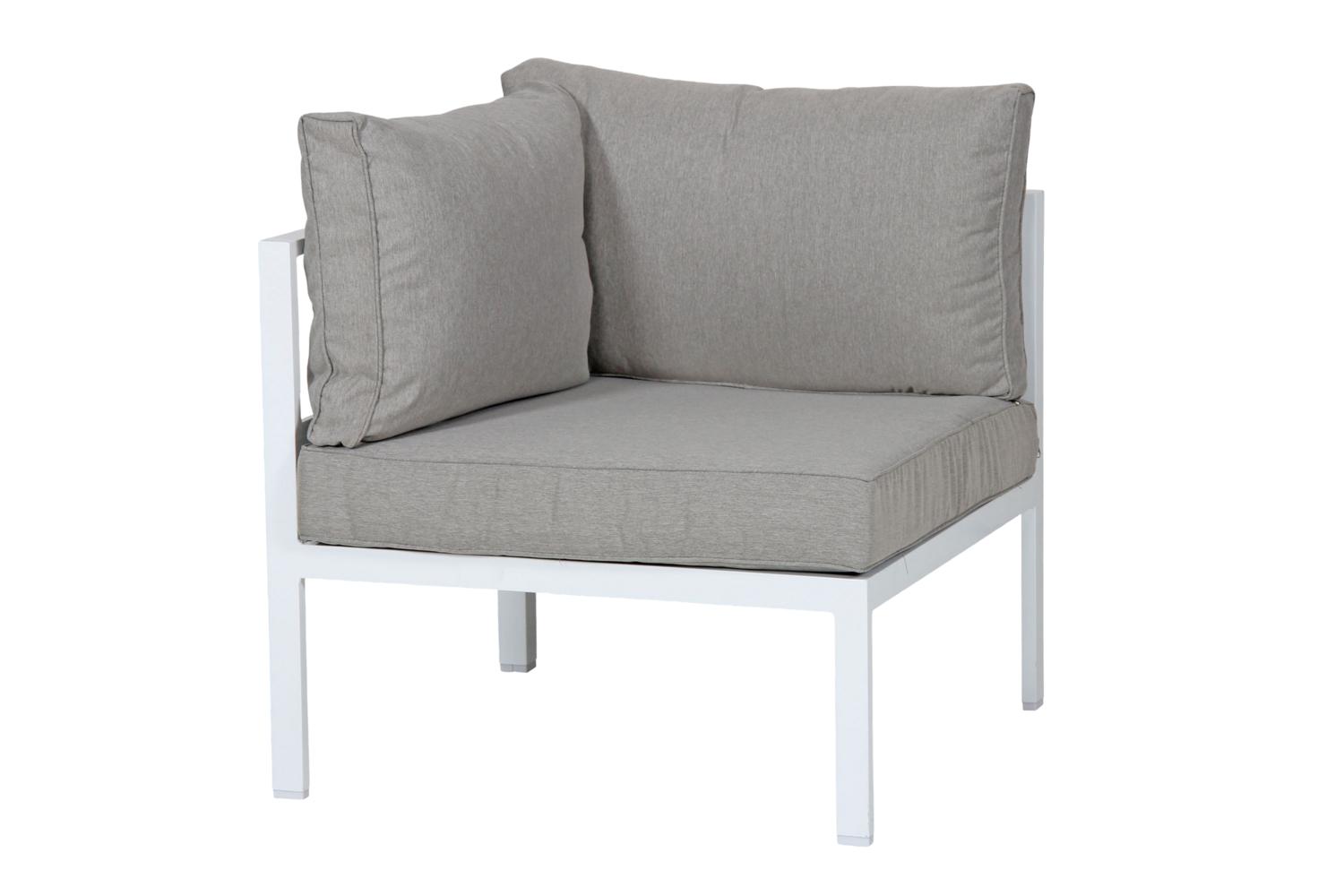 Prisvärd, populär och stilren möbelserie – Hörnmodul till byggbar soffa i mattlackad aluminium med grå dynor.