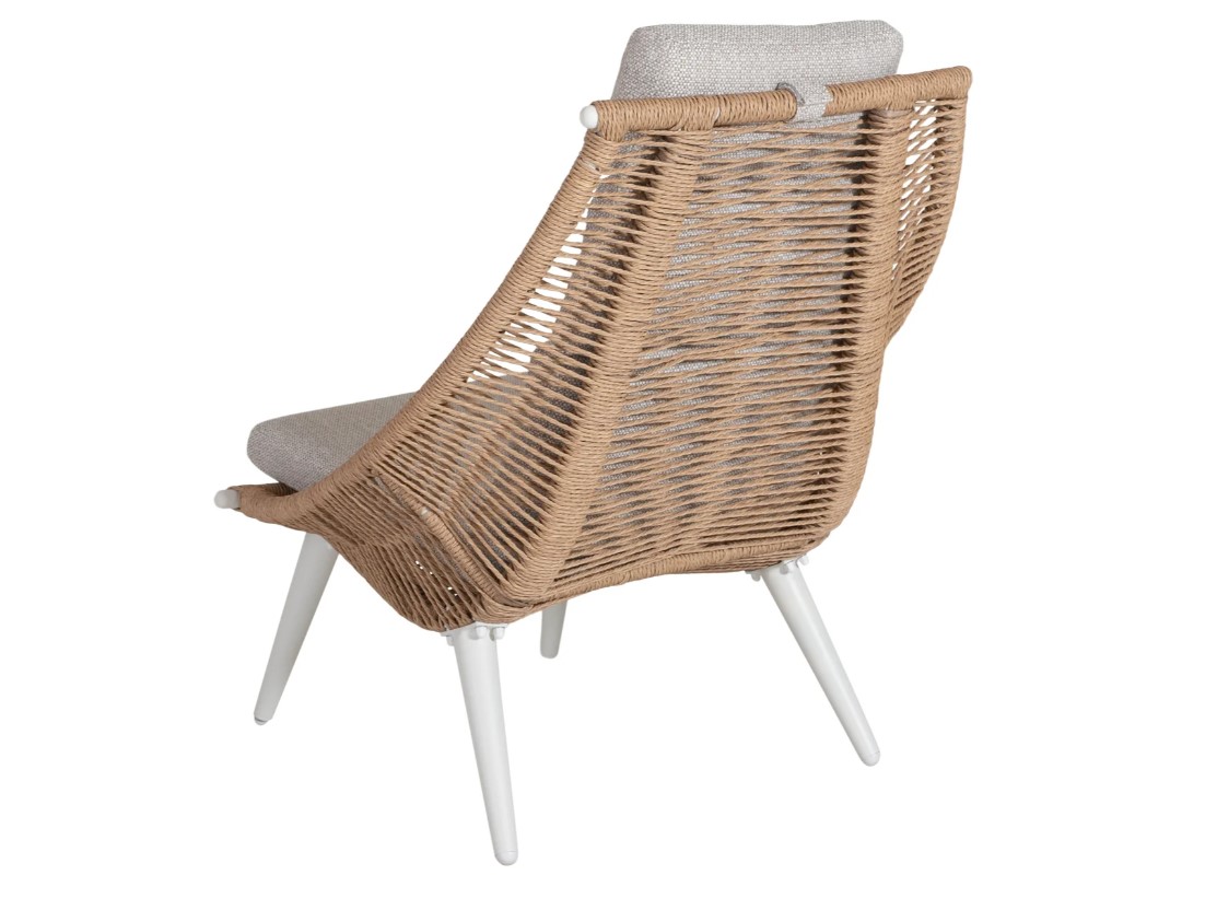 Menorca fåtölj har en stomme av tåligt aluminium och är klädd i naturfärgat rep.