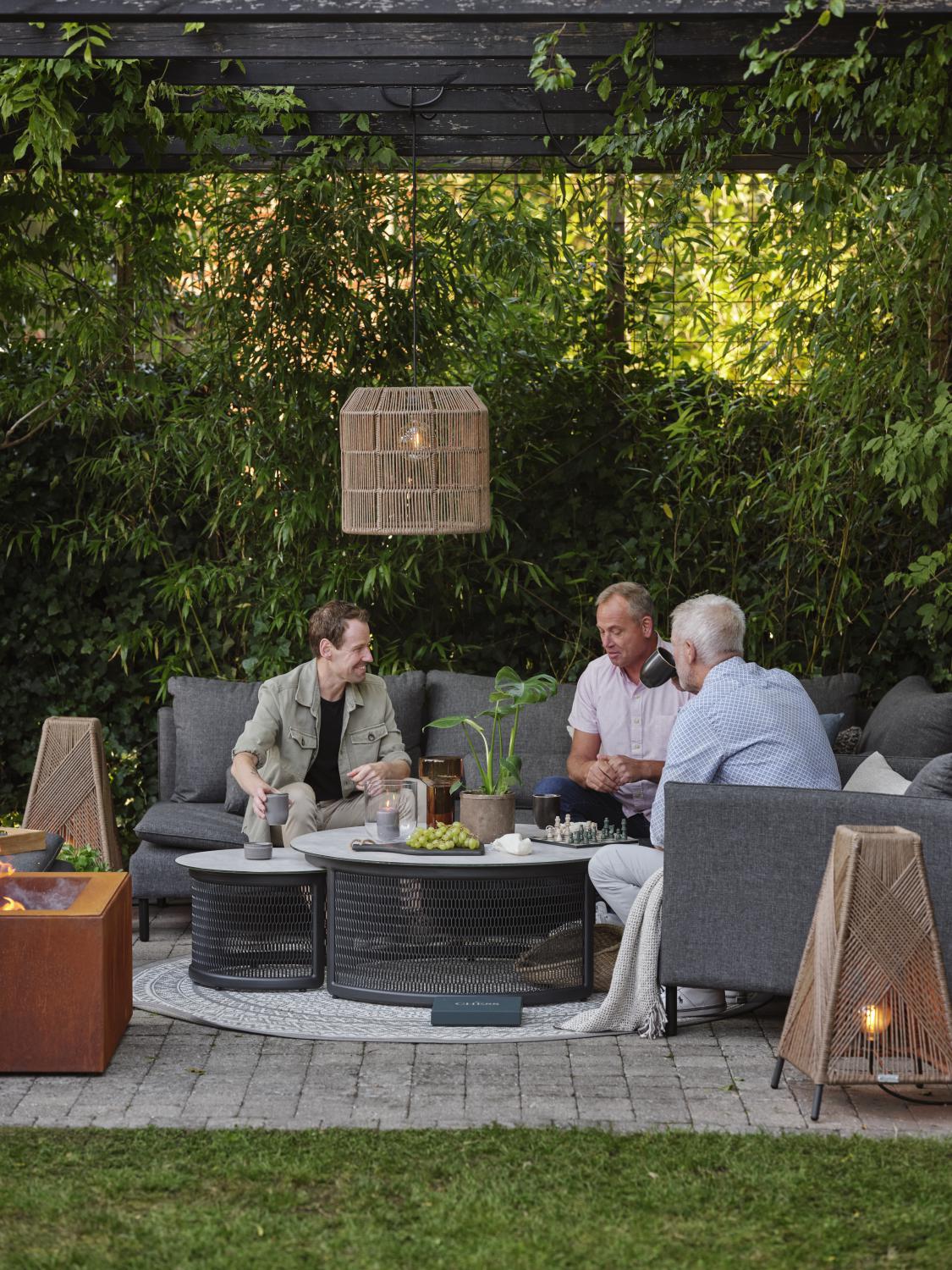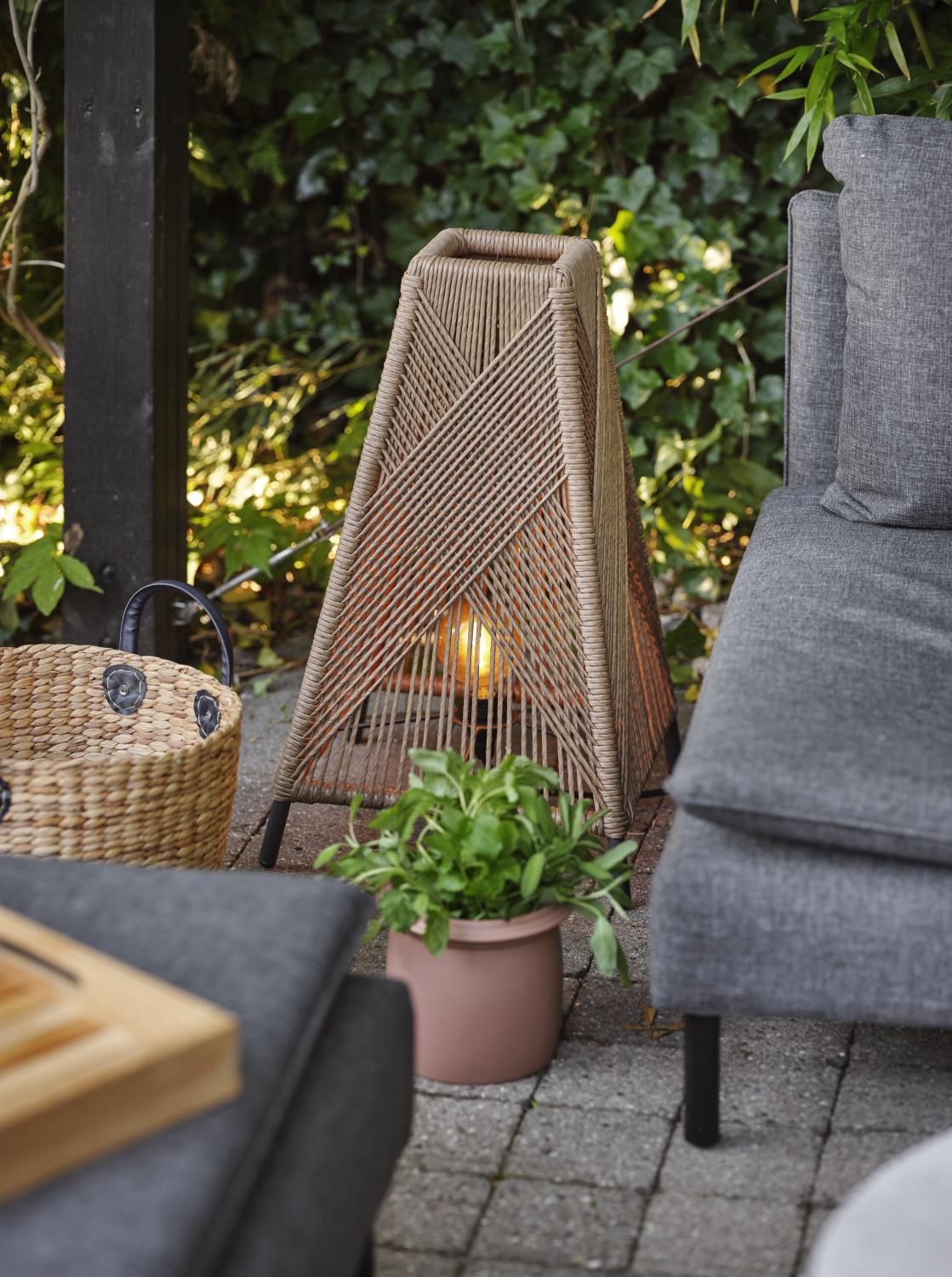 Vacker pyramidformad golvlampa. Den transparenta skärmen är flätad för hand i twistad konstrotting och passar lika bra på uteplatsen som i uterummet. Det vackra mönstret ger härligt stämningsljus och skapar en ombonad känsla. Komplettera med utesladden Cord.