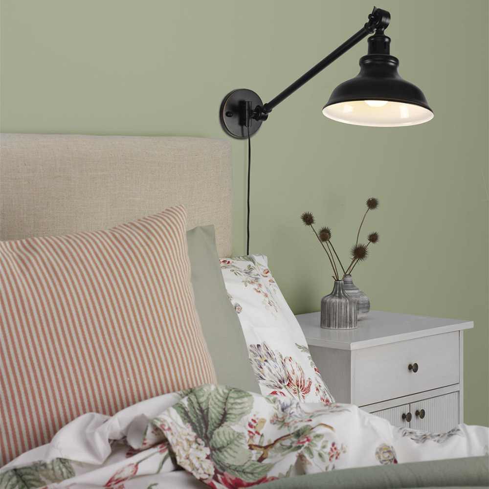 New Haven vägglampa i antiksvart finish med guldfärgad dekor är en rustik och tidlös vägglampa med en justerbar arm. Armen är vridbar både upp och ner samt i sidled.