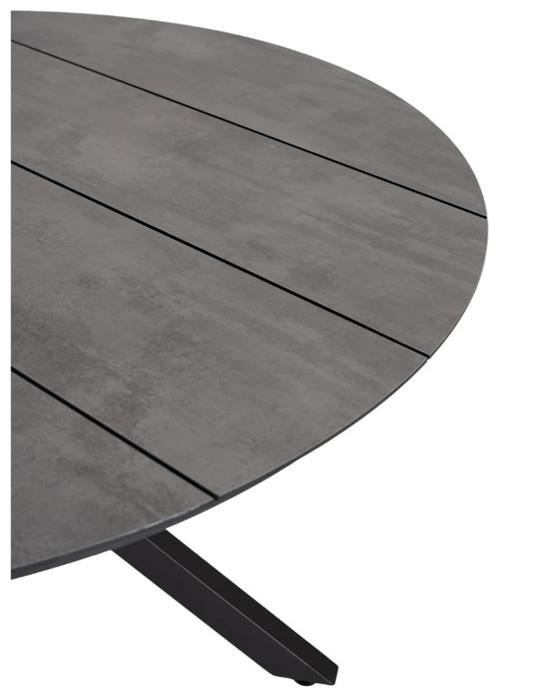 Palma är ett runt utebord med diameter 119 cm tillverkat på en stomme i grå aluminium med en toppskiva i antracitfärgad högtryckslaminat med betonglook.