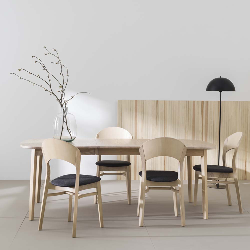 Stiligt matbord helt i massiv ask med rundad toppskiva och raka linjer på de snedställda benen. Utsökt design av Markus Johansson!