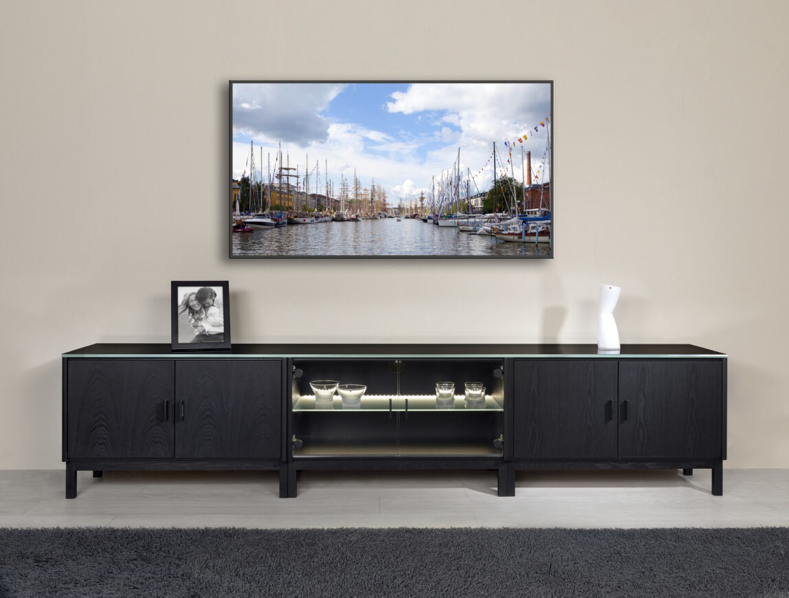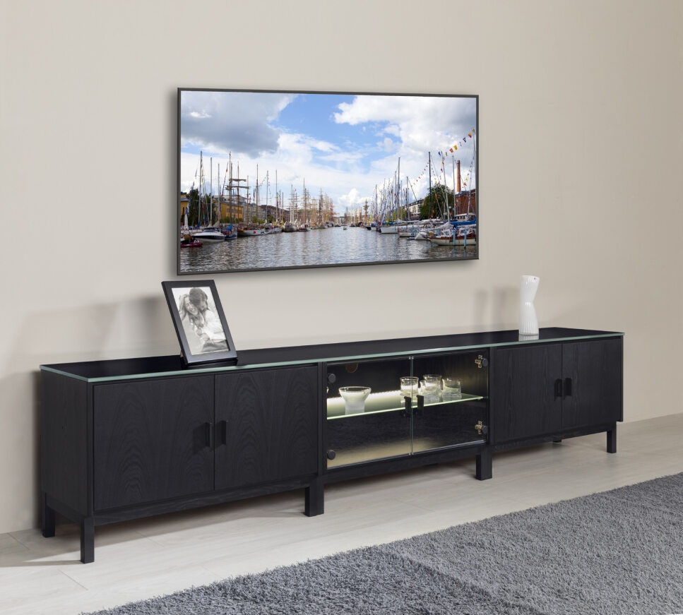 Mediabänken på bilden är i svart ask med glasskiva och dörrar enligt följande kombination: