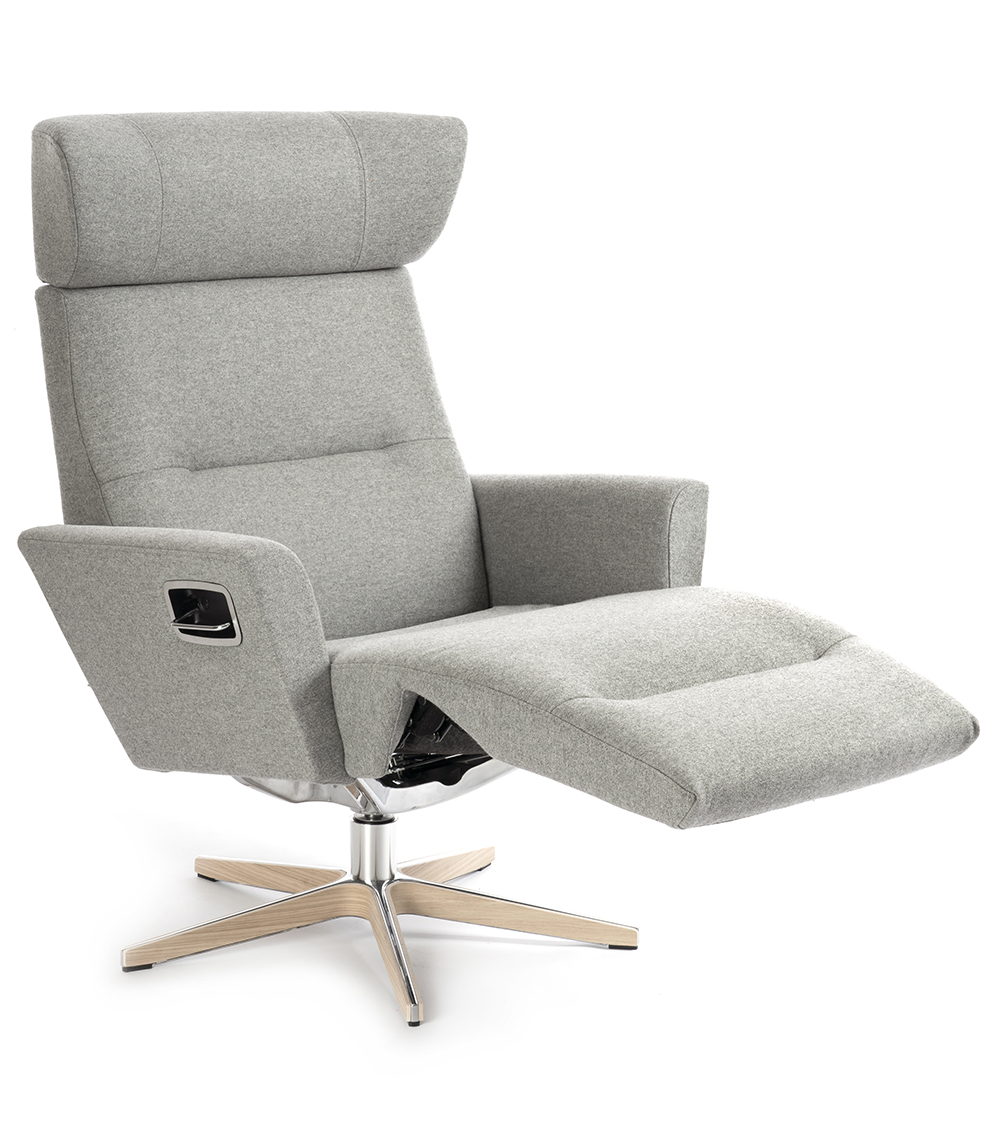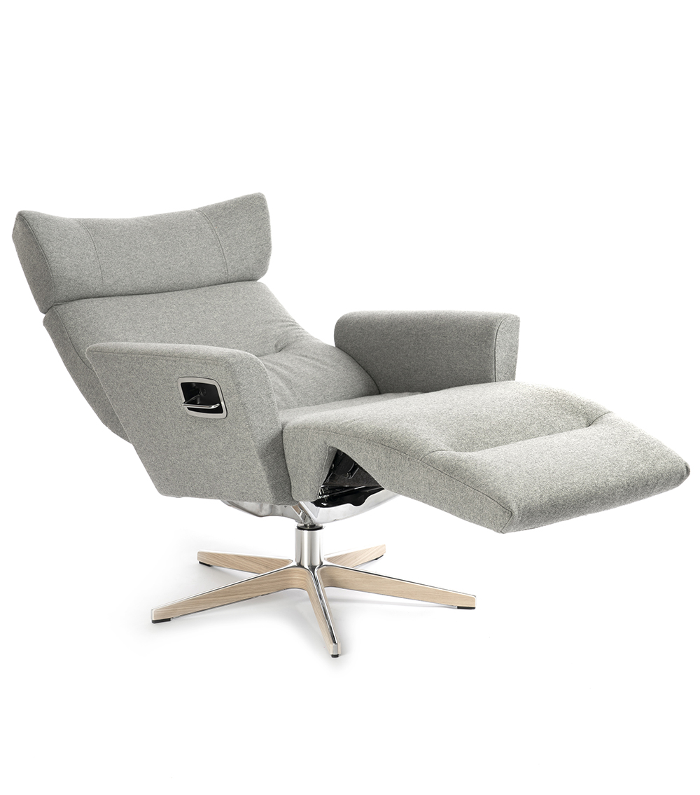 Relieve är en exklusiv fåtölj i tyg med steglöst fällbart rygg- och fotstöd. Dessa regleras individuellt med separata handtag på vardera sida. Det går otroligt mjukt och följsamt att reglera dem.