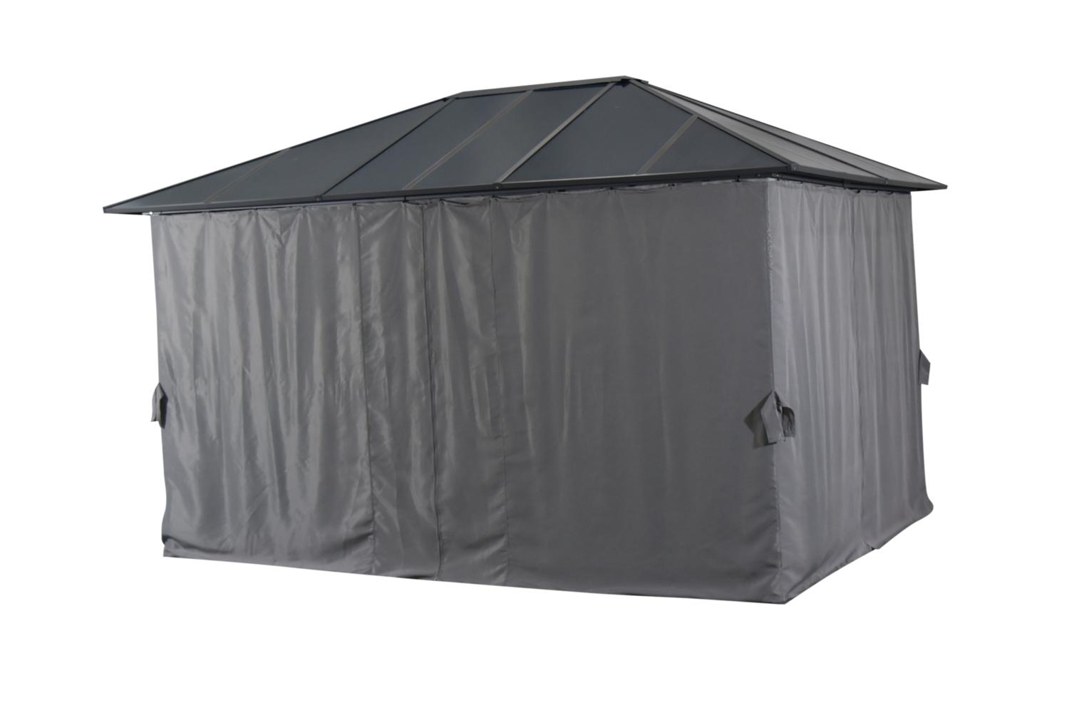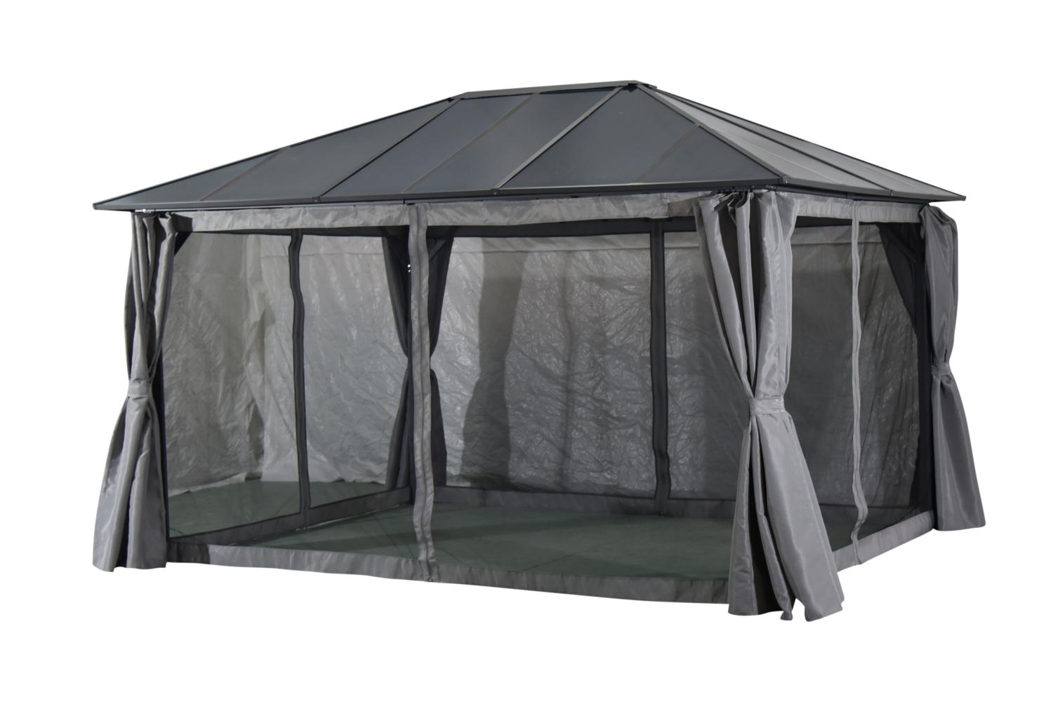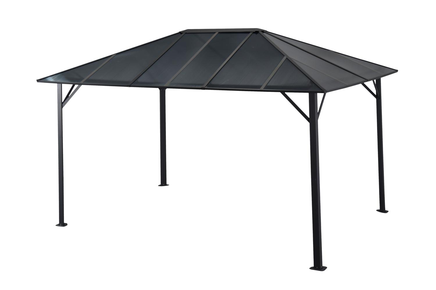 Scopello paviljong från Brafab. En trädgårdspaviljong ger inte bara skydd för regn, sol eller vind, utan skapar också en fin liten oas i din trädgård som lockar till sköna, lata stunder. Paviljongen är tillverkad av underhållsfri aluminium och har takplattor av polykarbonat.