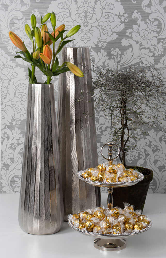 Siverfärgad vas i aluminium, 50 cm i höjd och 16 cm i bottenbredd.