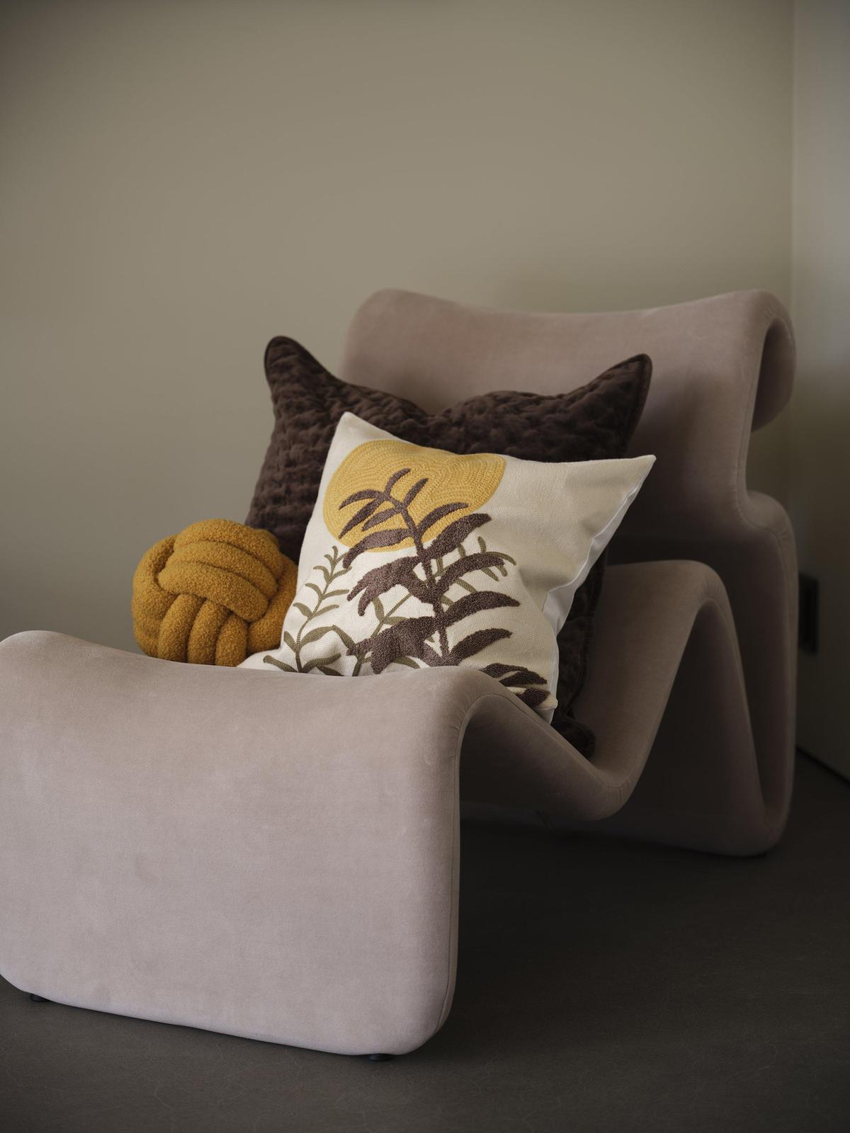 Mönstrat kuddfodral med broderat mönster på framsidan, enfärgad baksida.